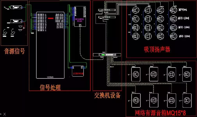 MQ-15為15寸有源音箱,通過Dante傳輸進入主交換機;MVP6內置功放Dante網絡傳輸?shù)奈斠粝?,每只吸頂喇叭通過音箱線并聯(lián)三只MV6-16,通過一根網線進入系統(tǒng)MR-4RP交換機,同時給MVP6吸頂24V供電;MR-4RP通過網線連接主交換機。調音臺輸出模擬信號給音頻處理器,音頻處理器通過網線連接主交換機,無需輸出模擬信號,通過Dante網絡傳輸協(xié)議進行數(shù)據(jù)處理。以Dante controller軟件進行通道配備選擇。
